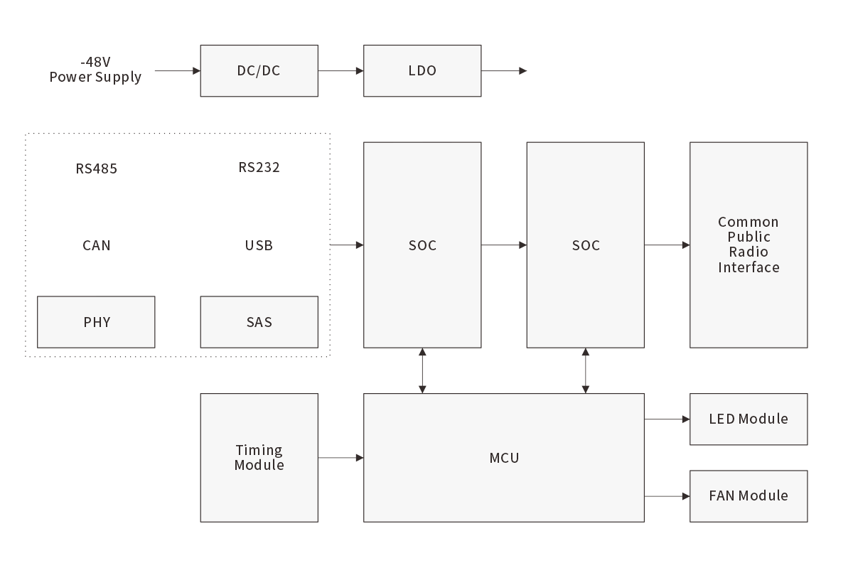 The BBU (Baseband Unit) is the base station's baseband processing unit, providing external interfaces and handling system resource management, operations and maintenance, and environmental monitoring functions. The BBU includes the main control unit FSMF module, baseband extension FBBA, and transmission extension FTIF.