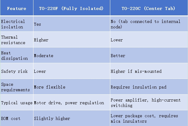 Both TO-220F and TO-220C are highly reliable and widely used in power electronics, but the correct choice depends on your electrical isolation requirements, thermal performance needs, and assembly conditions. Understanding these differences ensures optimal device performance and cost efficiency.
